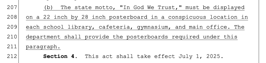 Now, 7 years later, Rep. Daniels is back with HB1009, detailing allowable religious expression in schools, mandating the playing of the national anthem each morning, AND expanding where and how the motto must be displayed.